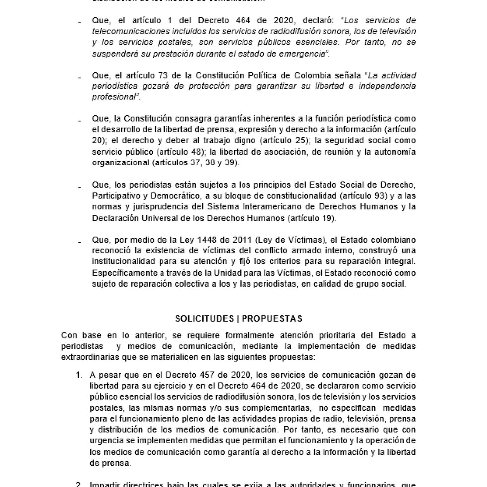 Gremios de base periodistas que representan en su totalidad a más de 2000 reporteros y trabajadores del sector en Colombia, preocupados por la crisis originada con ocasión de la pandemia COVID-19, que afecta gravemente a los medios de comunicación y periodistas independientes y el pleno ejercicio de su actividad, han elevado al presidente Iván Duque, un documento con argumentos y fundamentos jurídicos para exigir la atención prioritaria y la implementación de medidas extraordinarias que se materialicen en las siguientes propuestas: